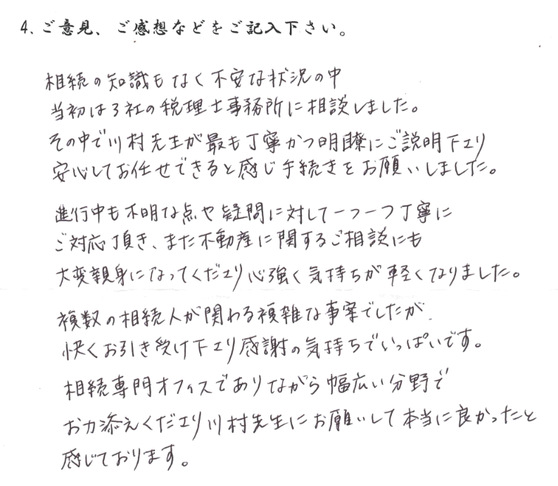 相続専門オフィスでありながら幅広い分野でお力添えくださり川村先生にお願いして本当に良かったと感じております。
