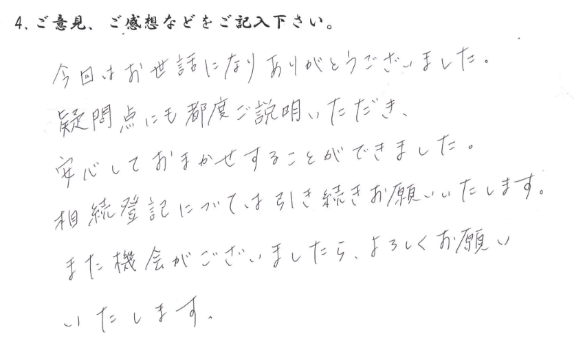 打合せでは相談しやすくわかりやすい説明で相続手続きもスムーズに進み大変感謝しております。