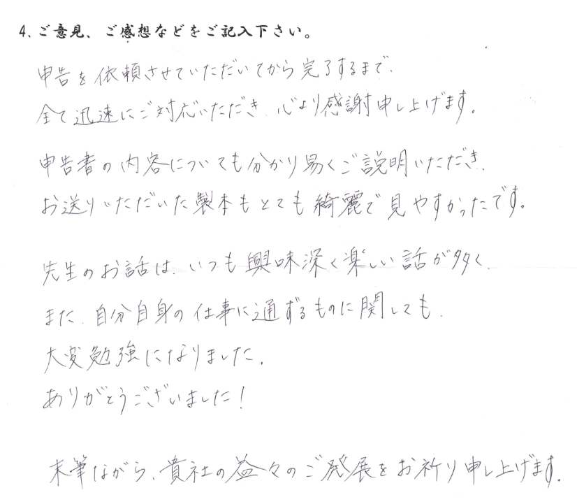 - 申告を依頼させていただいてから完了するまで、全て迅速にご対応いただき、心より感謝申し上げます。